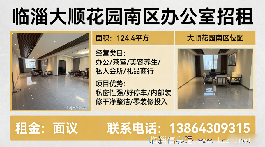 办公室位置:临淄大顺花园南区办公室面积:124.4平方项目情况:办公室内部精装修 精装会所带独立卫生间和淋浴热水器!经营类目:可办公,茶室,美容养生、私人会所、礼品商行等。项目优势:私密性强、好停车、