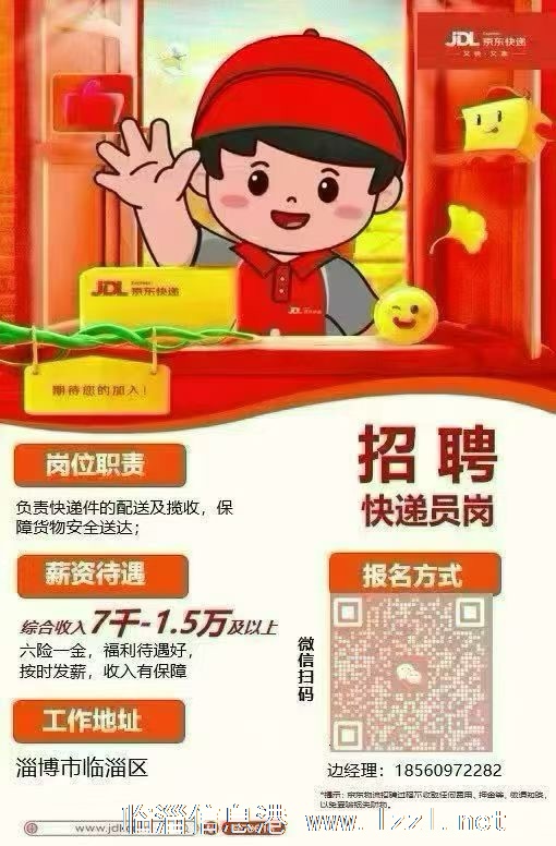 【世界50强企业】 京东招聘快递员、签订正式劳动合同,缴纳六险一金,薪资7000起。详情联系方式:18560972282,上班地点临淄城区内工作,无夜班 长白 月休4天
